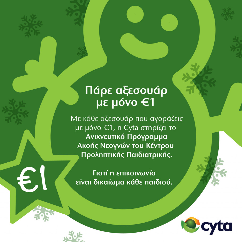 Έντονο και μαζικό ήταν το ενδιαφέρον του κοινού για το παζαράκι με παλιά αξεσουάρ τηλεπικοινωνίας που πραγματοποιήθηκε στα κατά τόπους καταστήματα της Cyta, σε όλη την Κύπρο. Καταβάλλοντας ένα συμβολικό ποσό, το κοινό αξιοποίησε την ευκαιρία για να αγοράσει αξεσουάρ για το κινητό ή το tablet του και να συμβάλει, ταυτόχρονα, στην οικονομική ενίσχυση του Ανιχνευτικού Προγράμματος Ακοής Νεογνών του Κέντρου Προληπτικής Παιδιατρικής “Αμερίκος Αργυρίου”.