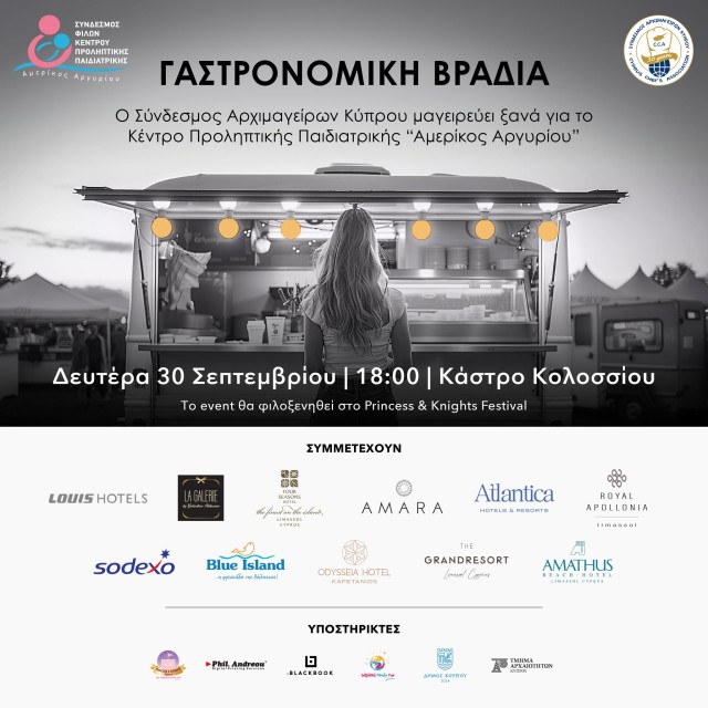 21-09-2024Ο Σύνδεσμος Αρχιμαγείρων Κύπρου μαγειρεύει ξανά για τον Σύνδεσμο Φίλων Κέντρου Προληπτικής Παιδιατρικής «Αμερίκος Αργυρίου»! Την Δευτέρα 30 Σεπτεμβρίου στις 18:00 οι βραβευμένοι Chef του Συνδέσμου Αρχιμαγείρων Κύπρου θα μαγειρέψουν ζωντανά το πιο γευστικό street food της πόλης! Μια πολύ ξεχωριστ...