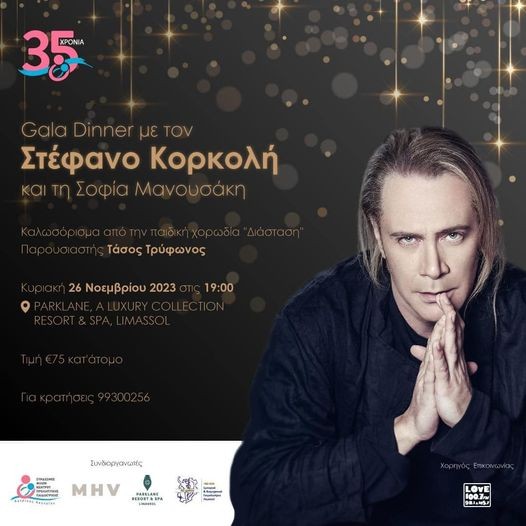 14-11-2023 Gala Dinner με τον Stefanos Korkolis και τη Sofia Manousaki! Στα πλαίσια της ετήσιας εκστρατείας Νοέμβριος - Μήνας Προληπτικής Παιδιατρικής, σας προσκαλούμε την Κυριακή, 26 Νοεμβρίου 2023 στο ξενοδοχείο Parklane, a Luxury Collection Resort & Spa, Limassol για το πιο κοσμικό pre-Christma...