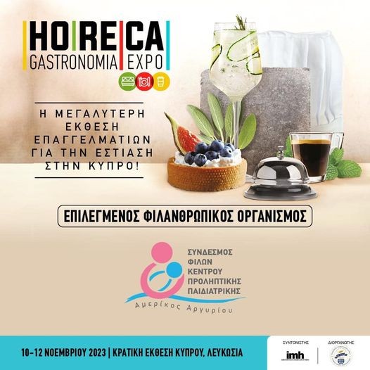 10-11-2023 Horeca Gastronomia Expo 2023 | 10-12 Νοεμβρίου 2023 Κρατική Έκθεση Κύπρου, Λευκωσια Είσοδος Δωρεάν Ο Σύνδεσμος Φίλων Κέντρου Προληπτικής Παιδιατρικής "Αμερίκος Αργυρίου" συμμετέχει ως ο επιλεγμένος φιλανθρωπικός οργανισμός με ενημερωτικό περίπτερο στην ετήσια μεγαλύτερη έκθεση επαγγελματιών...