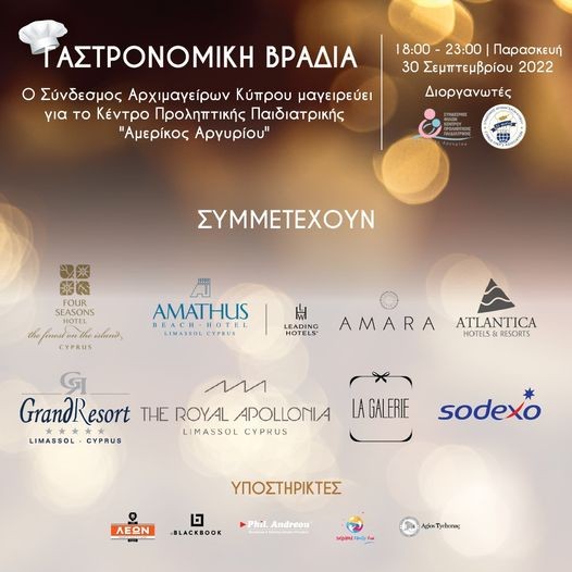 22-09-2022 Ο Σύνδεσμος Αρχιμαγείρων Κύπρου μαγειρεύει για τον Σύνδεσμο Φίλων Κέντρου Προληπτικής Παιδιατρικής «Αμερίκος Αργυρίου»! Την Παρασκευή 30 Σεπτεμβρίου στις 18:00 οι βραβευμένοι Chef του Συνδέσμου Αρχιμαγείρων Κύπρου θα μαγειρέψουν ζωντανά το πιο γευστικό street food της πόλης! Μια πολύ ξεχωριστή...